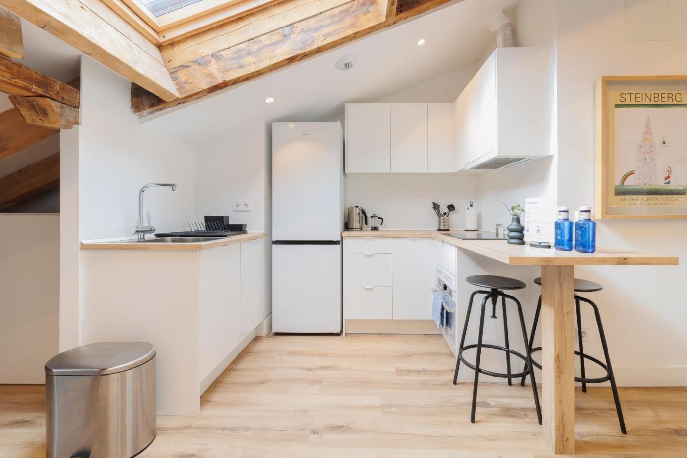 Apartamento. Este apartamento es amplio y cuenta con 1 sala de estar, 1 dormitorio independiente y 1 baño con ducha y artículos de aseo gratuitos. La cocina está equipada con nevera, lavavajillas, utensilios de cocina y horno. El apartamento tiene aire acondicionado, TV de pantalla plana, lavadora, entrada privada, teteracafetera y vistas a una calle tranquila. La unidad ofrece 1 cama. ;