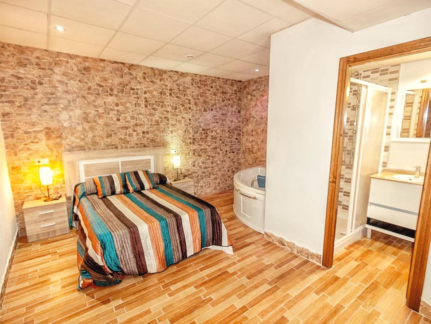 Villa con piscina privada. This luxurious villa features a pool with a view, a hot tub and a fireplace. Featuring a private entrance, this air-conditioned villa is comprised of 1 living room, 1 separate bedroom and 1 bathroom with a bath and a shower. Guests will find a stovetop, a refrigerator, kitchenware and a microwave in the fully equipped kitchen. The villa also has a barbecue. Boasting a terrace, this villa also offers a washing machine, a tea and coffee maker and a flat-screen TV. The unit offers 2 beds.
